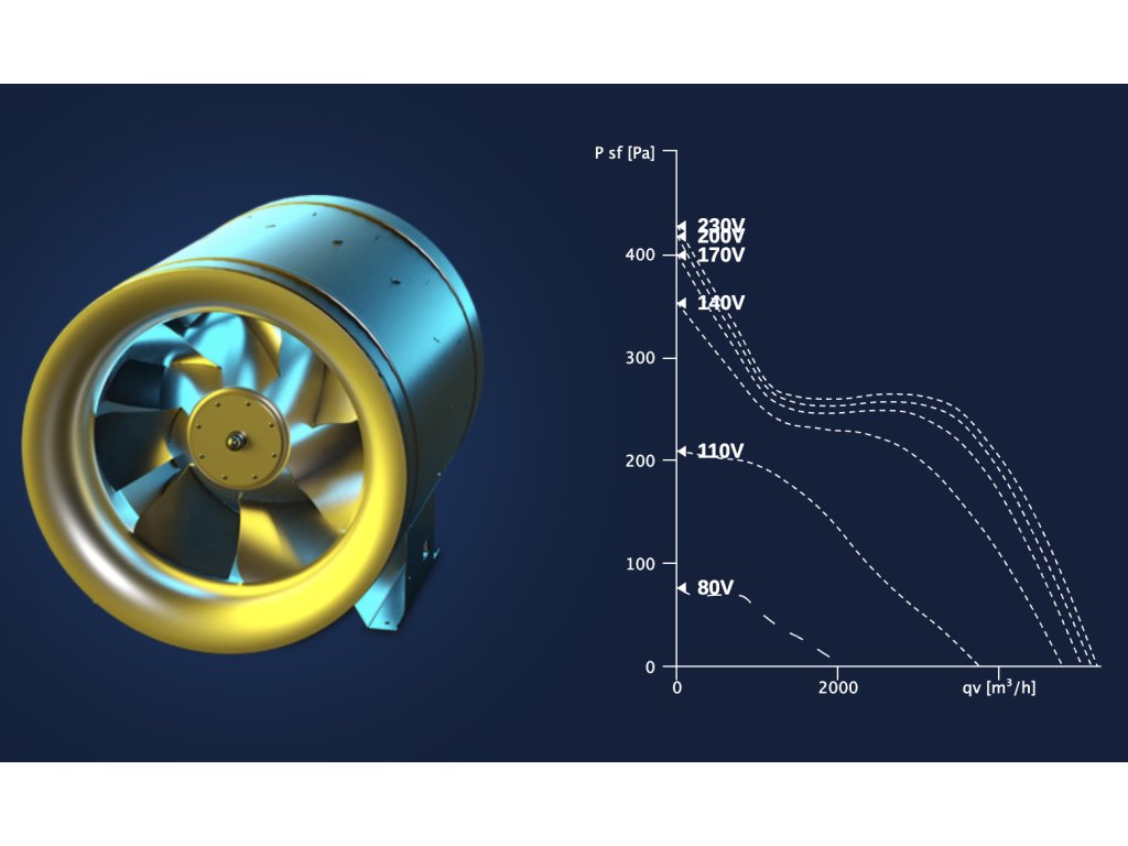 - EC motor (elektronicky komutovaný) – až o 50 % úspornější, tišší a s možností plynulé regulace výkonu (0–10 V). Vhodný pro trvalý provoz a systémy s požadavkem na nízkou hlučnost.