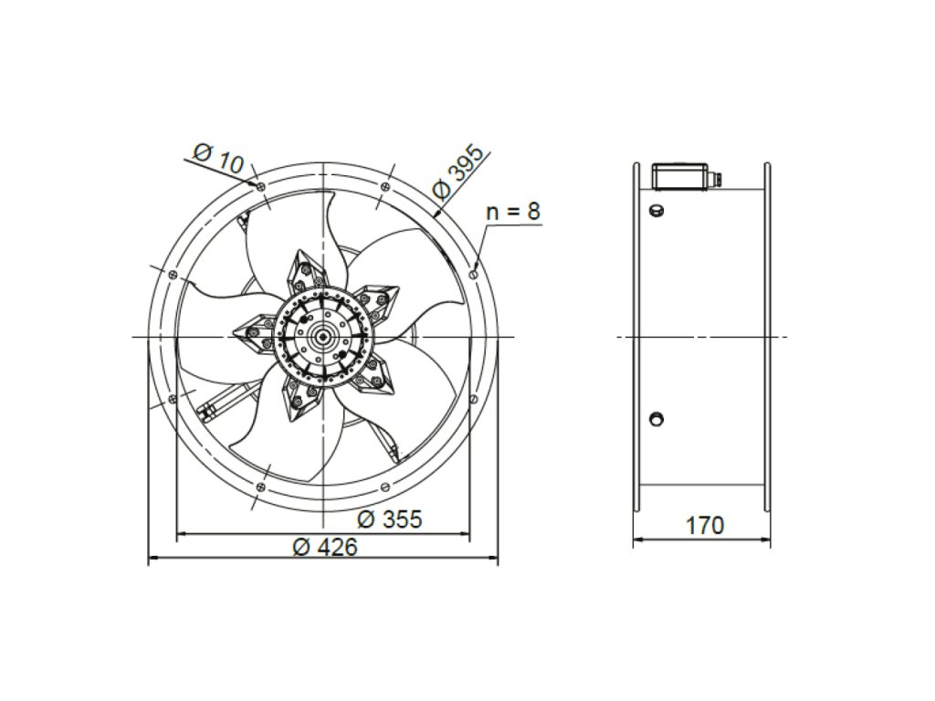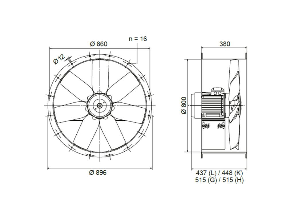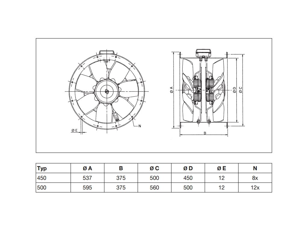 Ventilátory jsou vyrobeny z ocelového plechu a jsou vybavené jednofázovými nebo třífázovými motory s tepelnou ochranou.