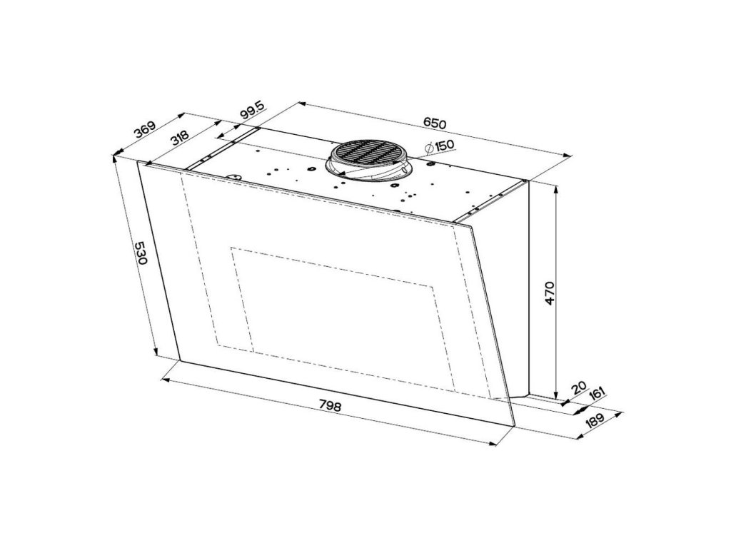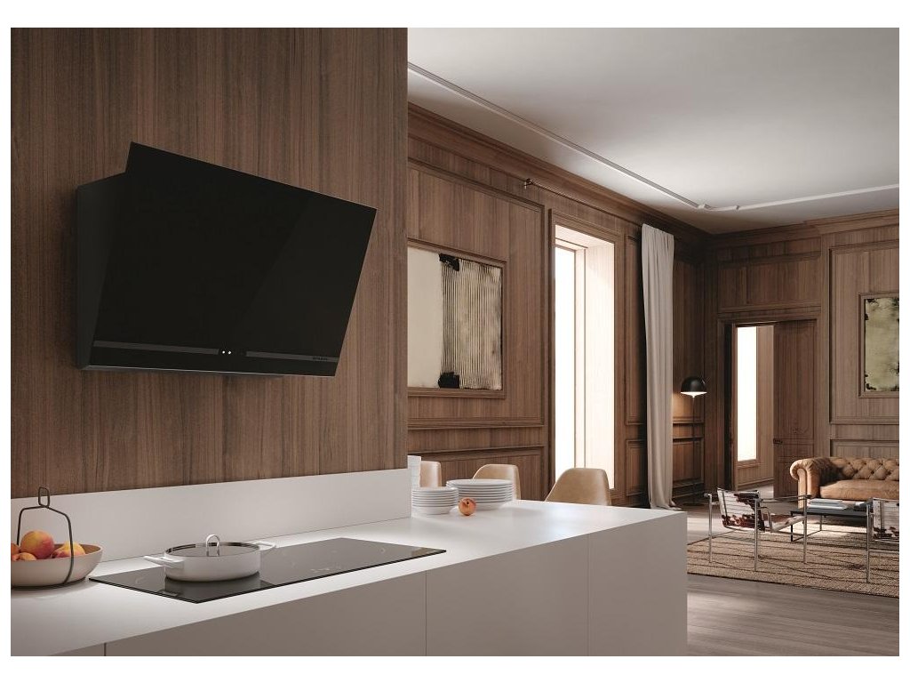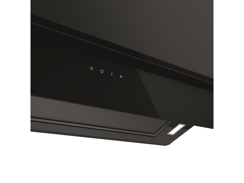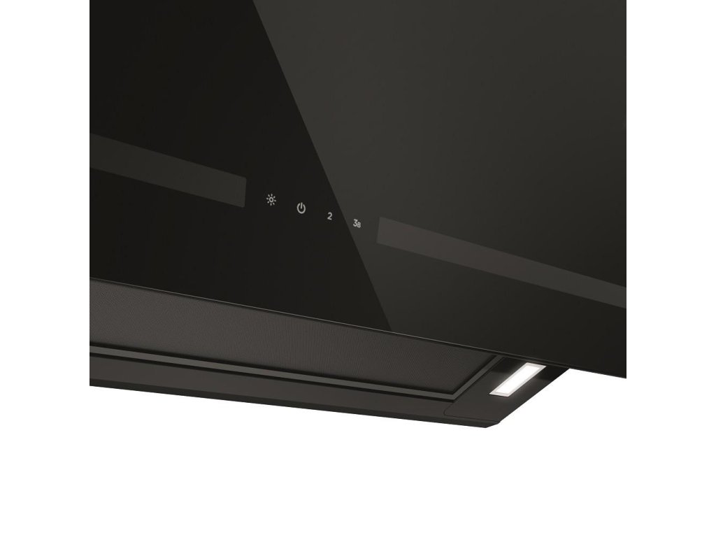 Digestoř má lesklý čelní panel z bezpečnostního skla s elegantním matným pruhem.